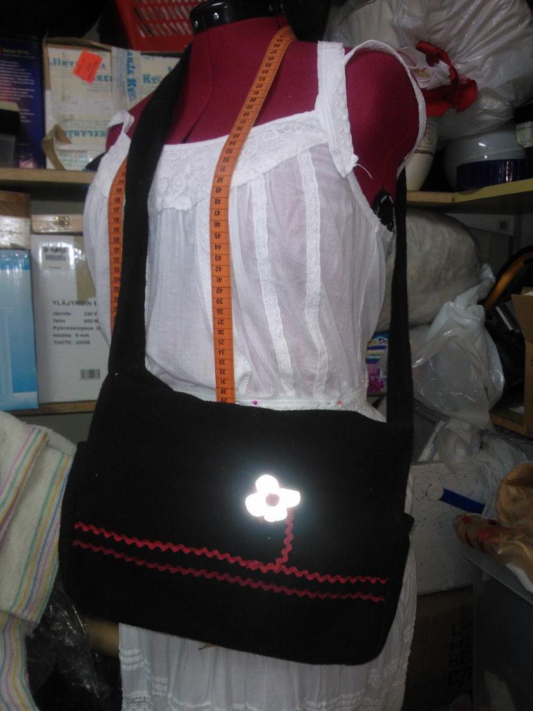 Ylijäämäkankaasta ja hameen helman koristeesta tein samantien sitten muhvimuotoisen käsilaukun.